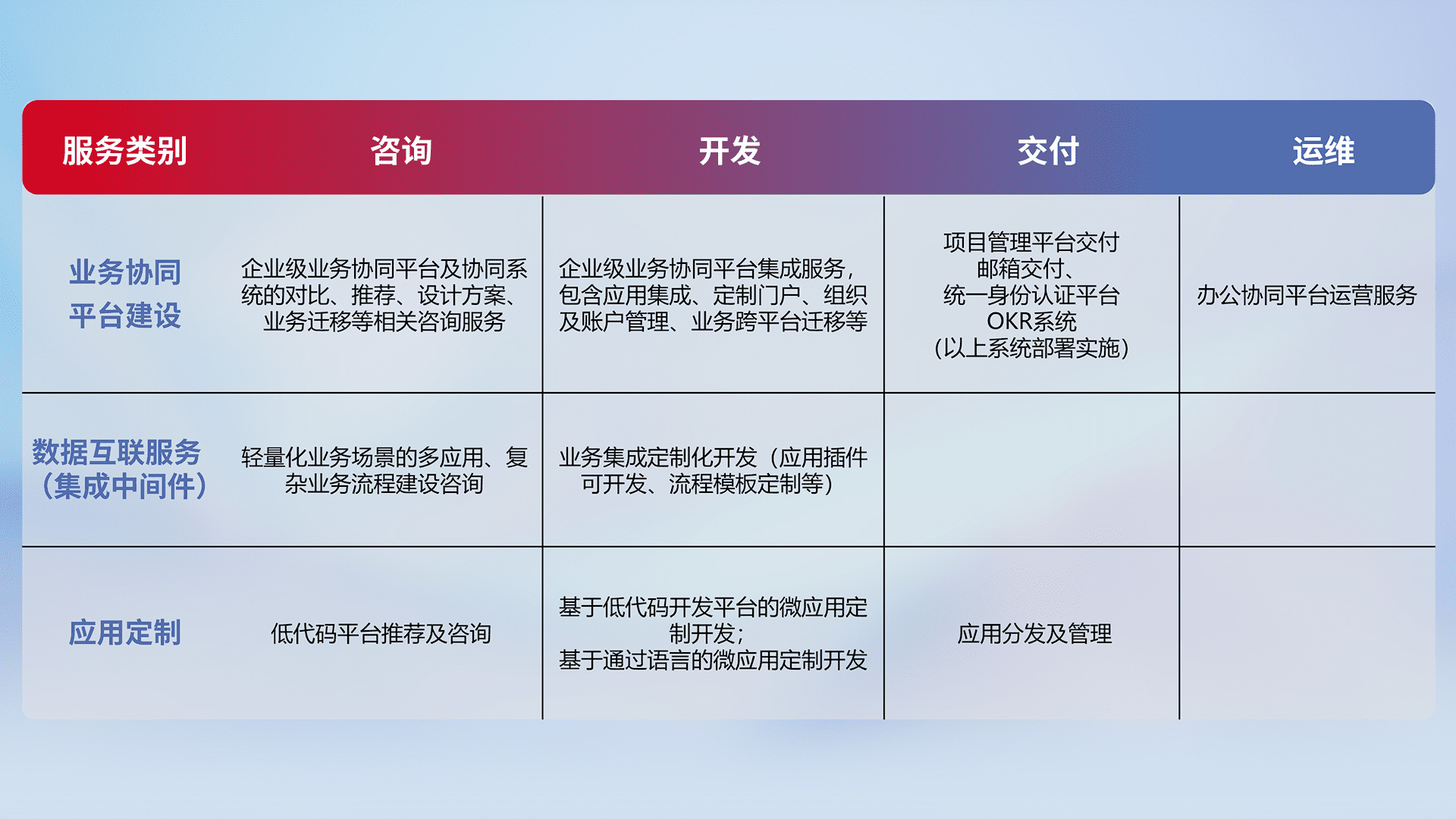 针对钉钉、、企微、、IDaas等平台级产品提供产品的规划、、、、方案、、、交付、、、定制化开发等服务,,,实现如统一协同办公、、、、智能客户服务、、混合会议管理、、智能数据查询、、、等业务场景,,,,实现数字化转型。。。